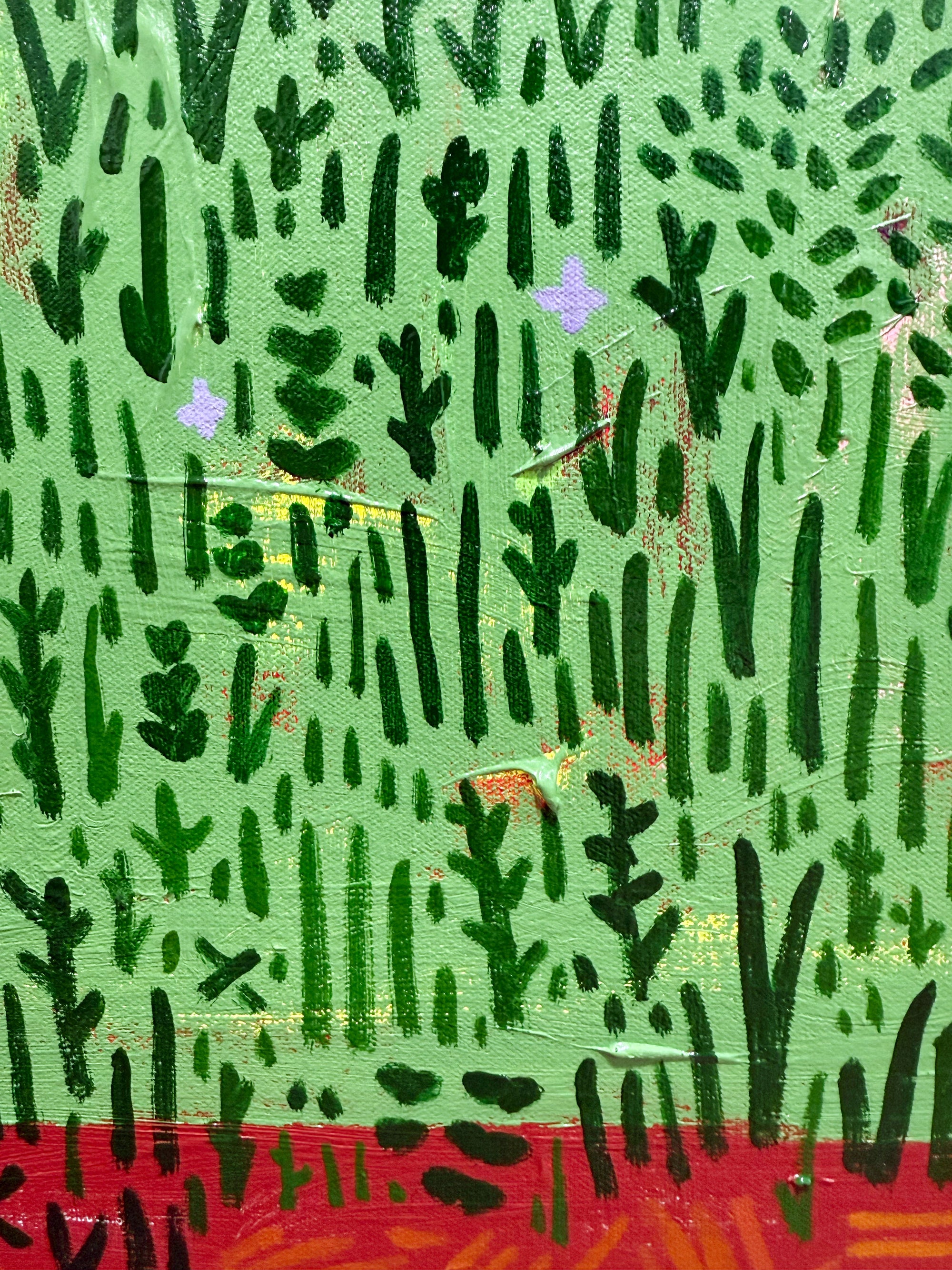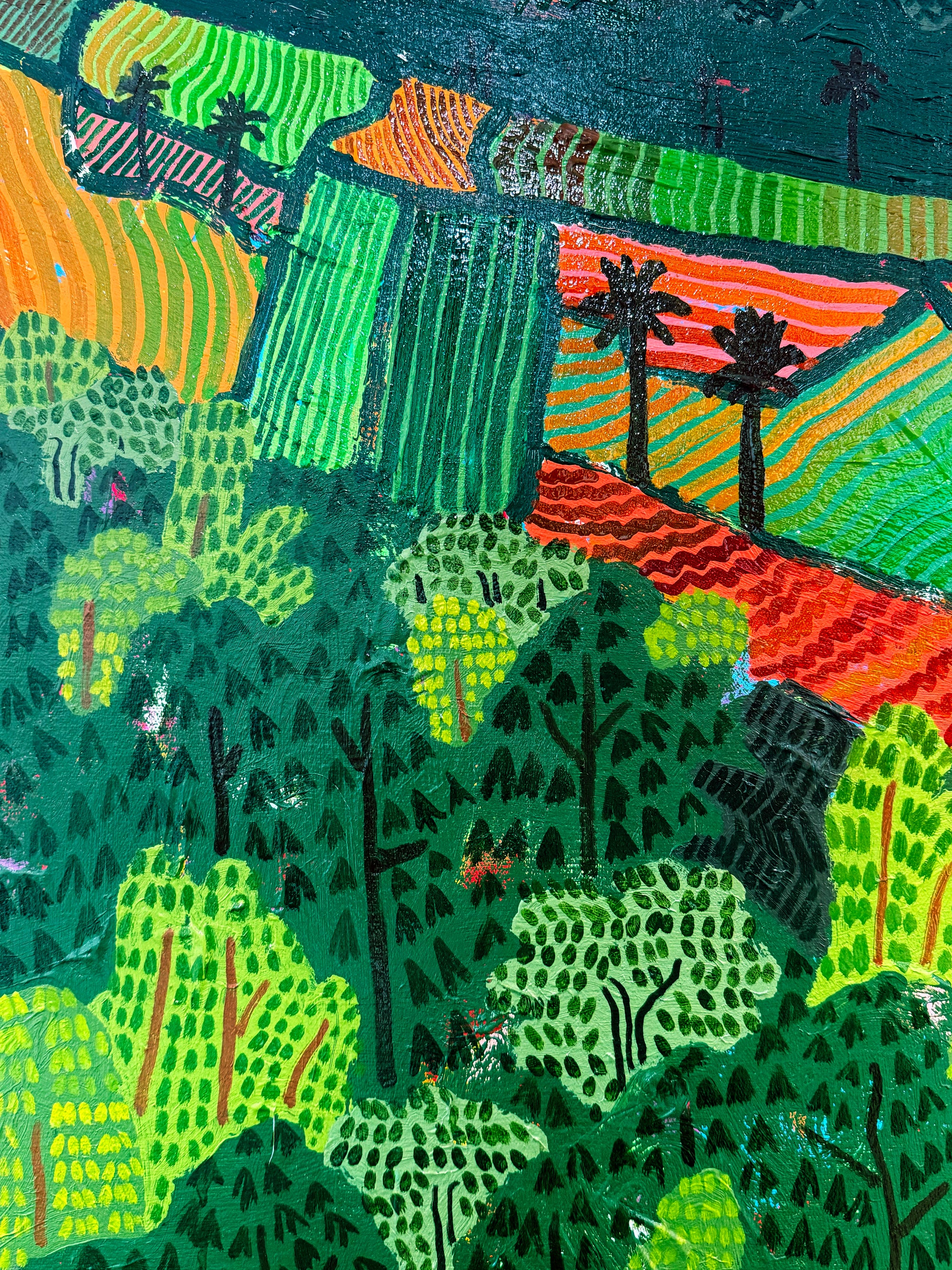 Despite his success in business, he returned to painting full-time, translating quick iPad sketches from his travels into richly layered compositions. His current work blends vibrant color, digital motifs, and expressive mark-making to evoke landscapes that are at once real, remembered, and imagined.